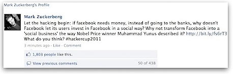 "Sa inceapa hackingul: Daca Facebook are nevoie de bani, de ce nu le permite utilizatorilor sa investeasca in loc sa mearga la banci? De ce nu transforma Facebook intr-o afacere sociala de tipul celei descrise de castigatorul Premiului Nobel, Muhammad Yunnus?"